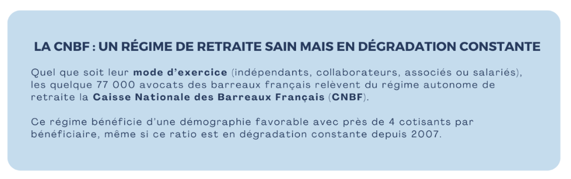Le ratio Valeur de Service / Coût d’Acquisition du point ressort à 8,39%, ce qui est largement plus efficace que les 5,61% de l’AGIRC/ARRCO. Cependant ce ratio est en baisse. La revalorisation de 2025 est certes de 2% pour le régime complémentaire des avocats (1,6% pour le régime AGIRC/ARRCO des salariés) mais inférieure à la revalorisation de 4,4% de la valeur d’acquisition des points. La réforme des retraites de 2023 s’applique aux avocats dans les mêmes conditions que les autres régimes. L’autonomie du régime CNBF des avocats n’est pas remise en cause.